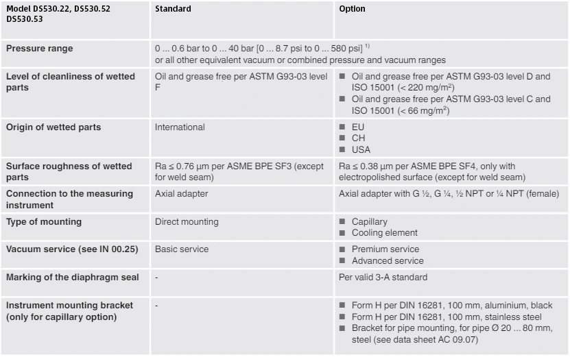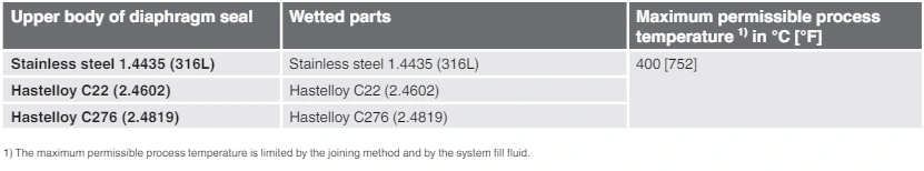 Model uszczelnienia przepony / Połączenie procesowe (rodzaj połączenia procesowego, standard rury, wymiar rury) / Materiał (górna część, przepona) / Szorstkość powierzchni zwilżone części / uszczelnienie / połączenie z przyrządem pomiarowym / poziom czystości zwilżonych części / pochodzenia zwilżonych części / certyfikatów